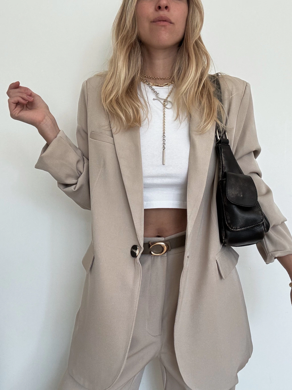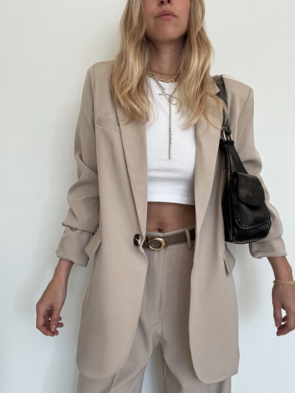 Blazer oversize armado con forrería interna a tono, hombreras y bolsillos delanteros. Contiene falso bolsillo en delantero y cuello solapa. Tela: 100% sastrera, calidad premium. Tiene una caída increíble y el largo es ideal para usarlo con jean, short en verano o con el pantalon sastrero haciendo conjunto <3. Tip para arremangar las mangas: le pones una gomita y lo subis para que quede ajustado; de esa forma no se te bajan ;) Super versátil, lo vas a amar!