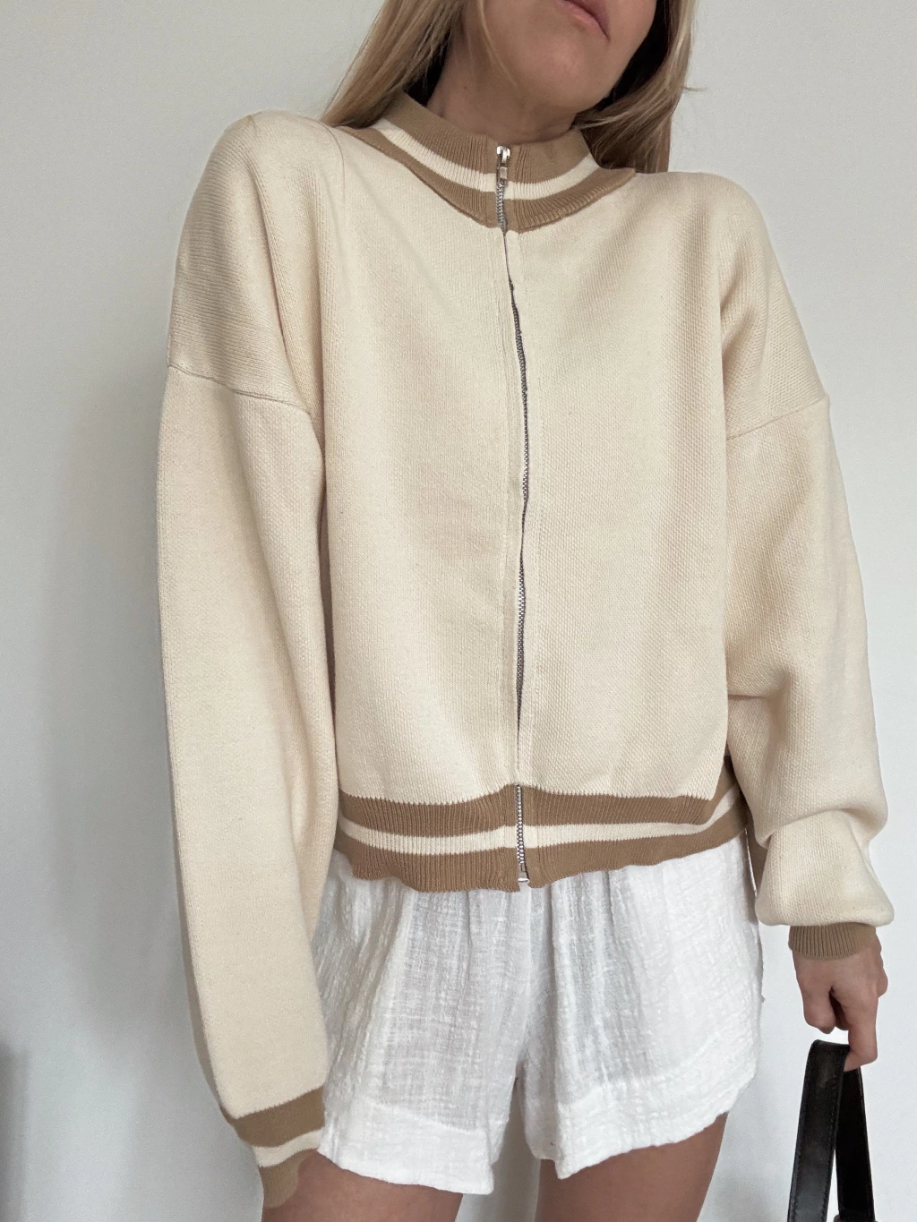 Cardigan college con cierre y rayas en cuello y puños. Material: algodón, 100% calidad premium. Composición: algodón peinado. El modelo es mega canchero! Lo podes combinar en cualquier estación del año ;) Es talle único y abarca varios talles debido a que es una prenda holgada.