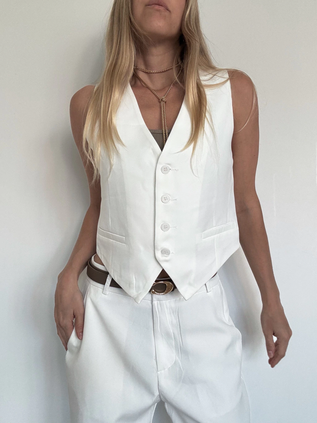 Chaleco sastrero escote V con pinzas delanteras, falsos bolsillos y botones delanteros. Forrería completa interna a tono. Tela: sastrera, 100% calidad premium. Ideal para usar con el pantalón málaga; ambos hacen el conjunto perfecto! También lo podes combinar con un short de jean para un look más urbano ;) La calidad es de otro mundo, no te vas a arrepentir.