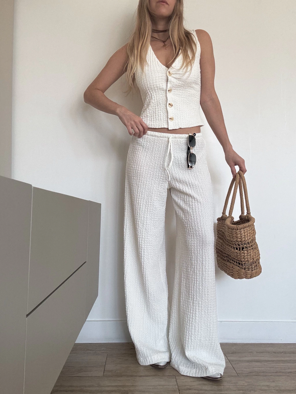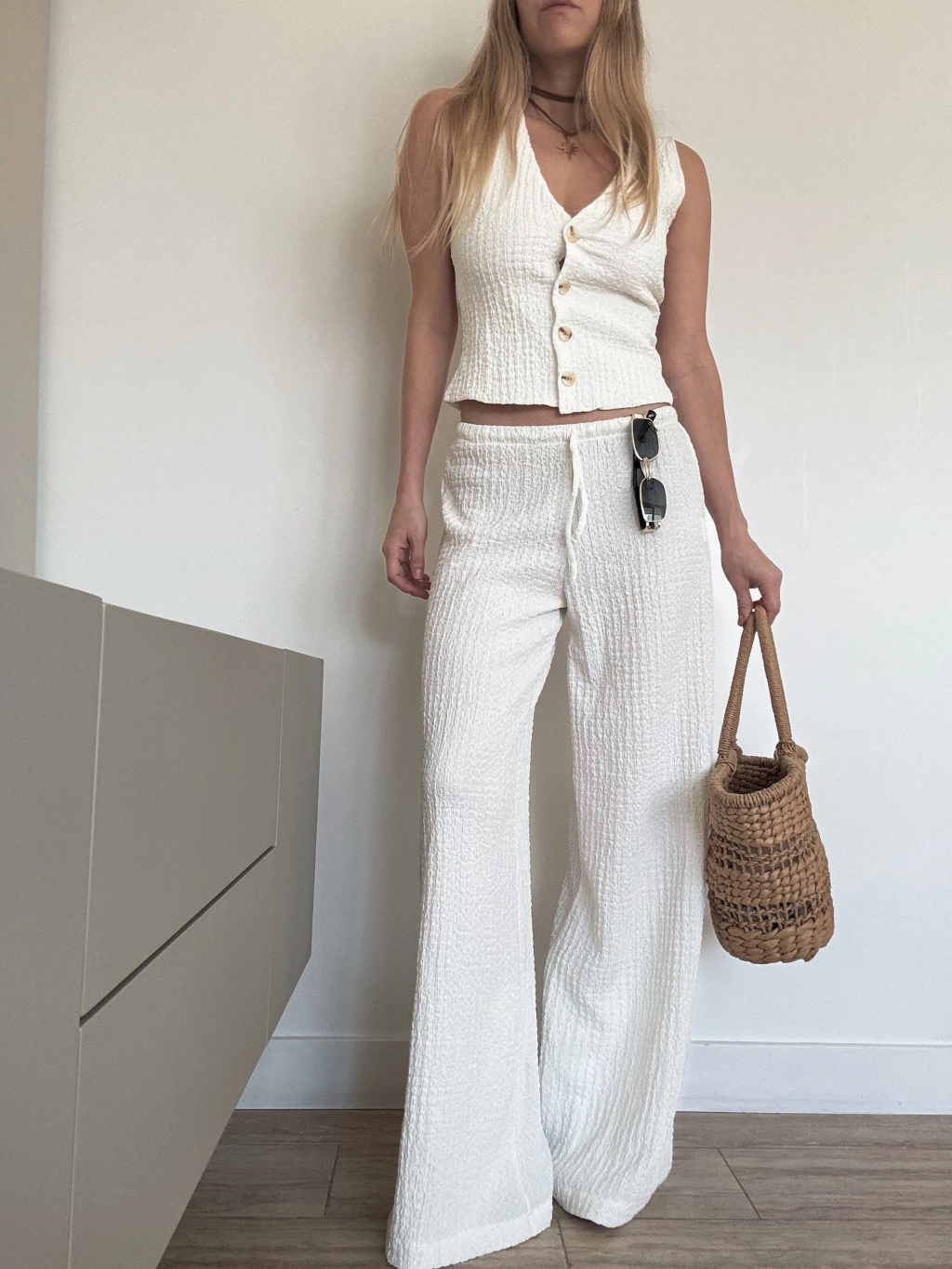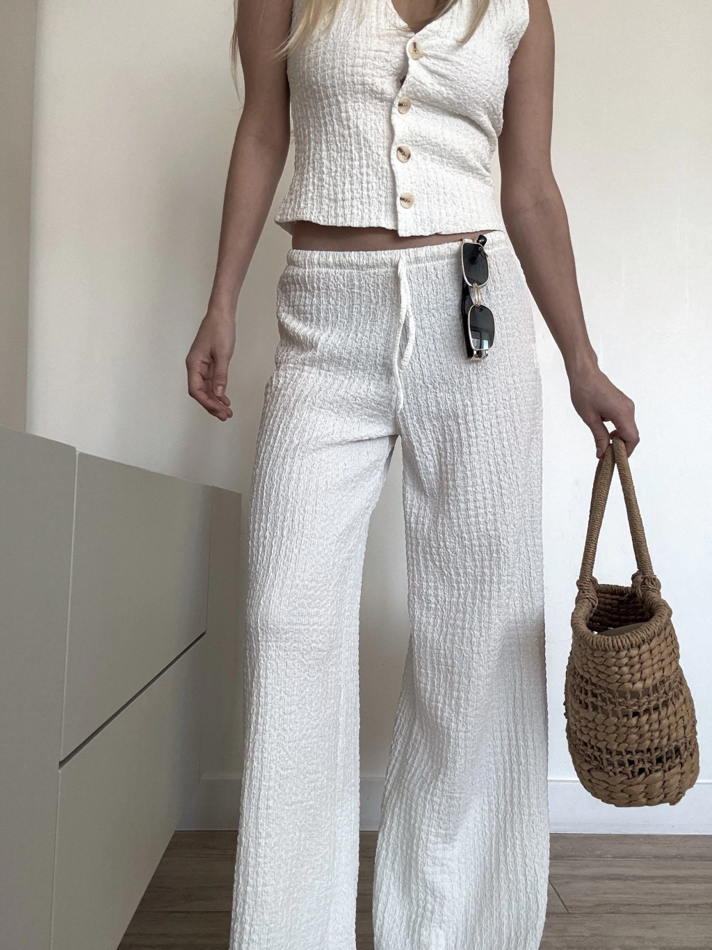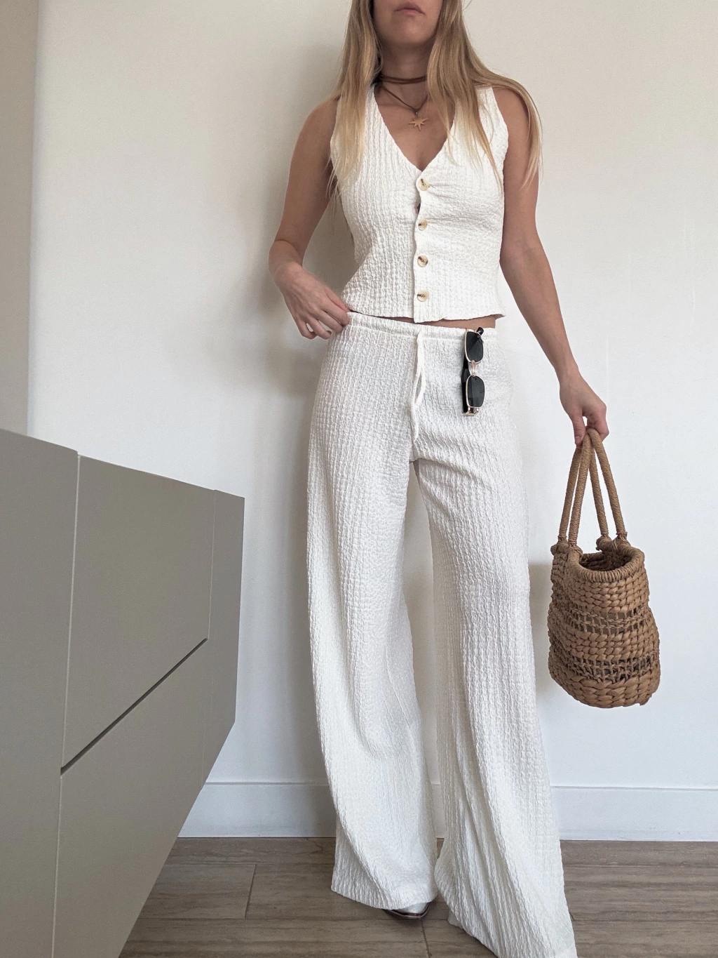 Conjunto de chaleco entallado escote V forrado en su interior, y pantalón tiro medio con elástico en cintura y lazo regulable a tono. Material: bambula punto, 100% calidad premium.El conjunto es soñado y super delicado, te va a enamorar :) Ideal para un evento de noche o también de día! Súper versátil. Aclaración: ambas prendas se venden juntas (chaleco + pantalón). A modo de referencia: la modelo mide 1.60 y esta usando un talle S.