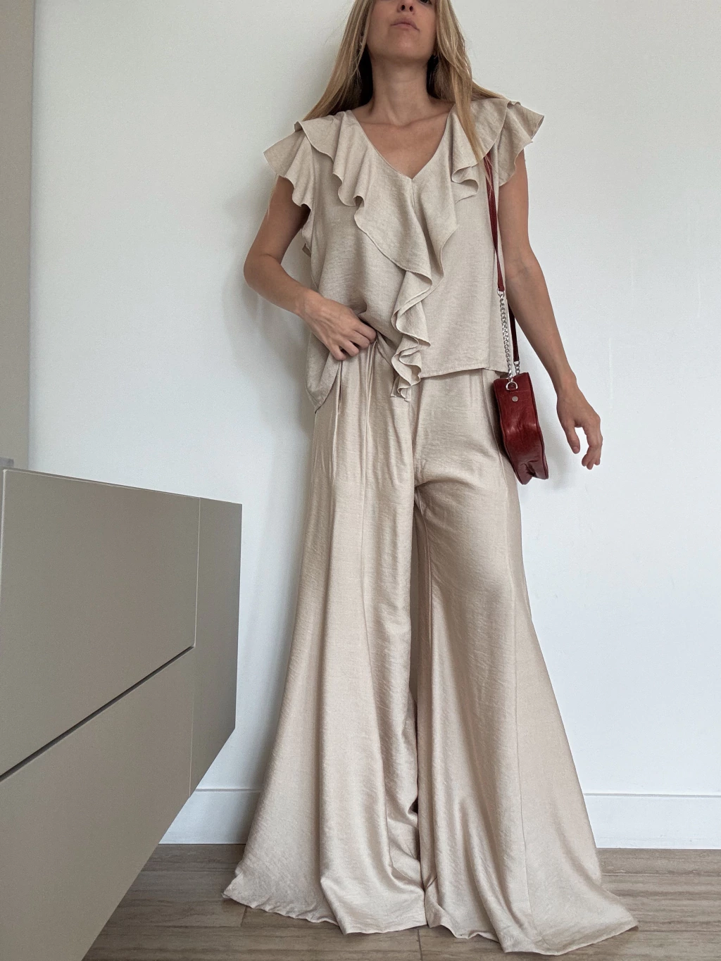 Conjunto de blusa con volados y palazzo tiro medio/bajo con bolsillos Y elástico en cintura. Material: lino madrileño, 100% calidad premium. El conjunto es soñado y super delicado, te va a enamorar :) Ideal para un evento de noche o también de día! Súper versátil. Aclaración: ambas prendas se venden juntas (blusa + pantalón). A modo de referencia: la modelo mide 1.60.