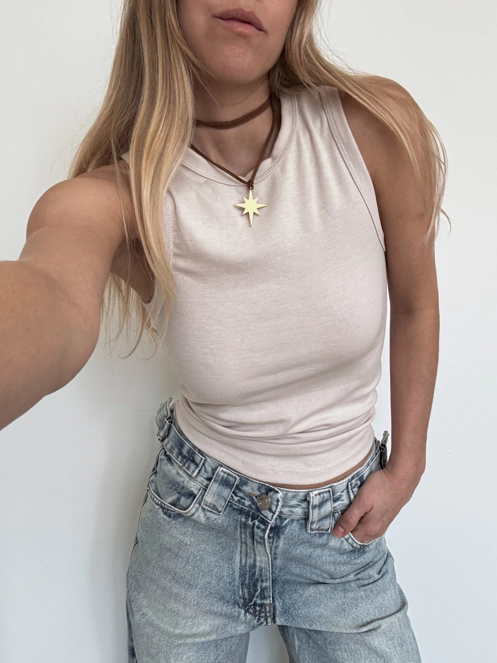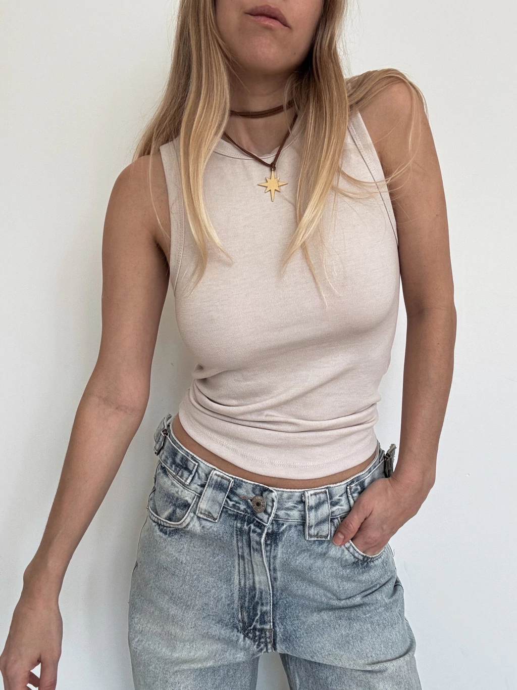 Musculosa básica tipo piel de durazno con escote cerrado y envivados anchos. Tela: jersey soft, 100% calidad premium. Un básico que te completa cualquier look, no falla :) Lo podes usar tanto para el día como para la noche. A modo de referencia la modelo tiene 90 cm de contorno de busto. Es bastante elastizada ;) La modelo esta usando talle Small.