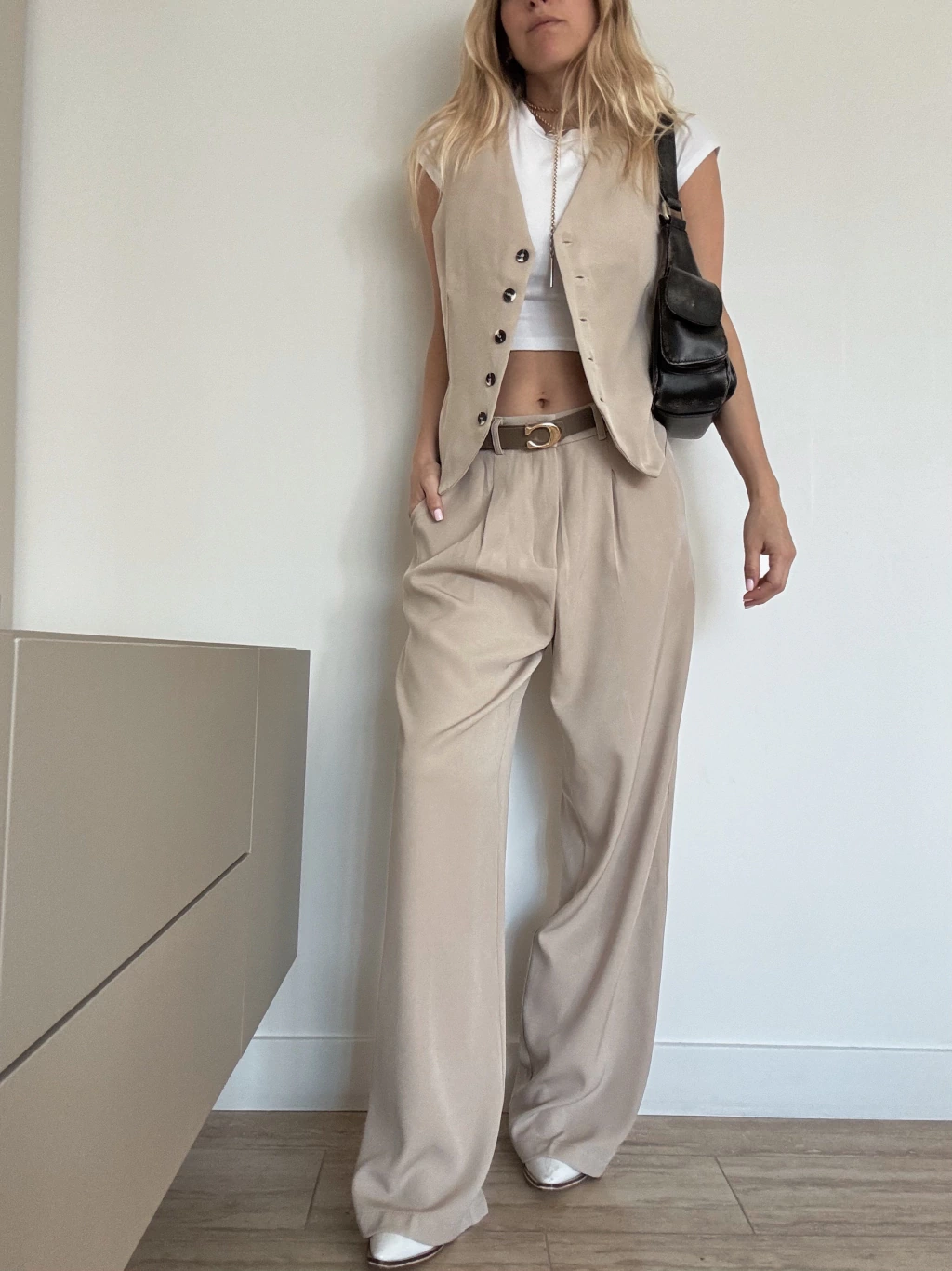 Pantalón tiro medio/alto con doble tableado en delantero. Contiene bolsillos y cierre frontal con boton. Falsos bolsillos traseros y pasa cinto para que le pongas el que más te guste :) Tela: sastrera, 100% calidad premium. Es super canchero y el color te va a enamorar. Ideal para usar con unas botitas haciendo conjunto con el chaleco para un evento, o con unas zapas y una remerita básica para un look más de día. La modelo mide 1.60 y esta usando talle S.