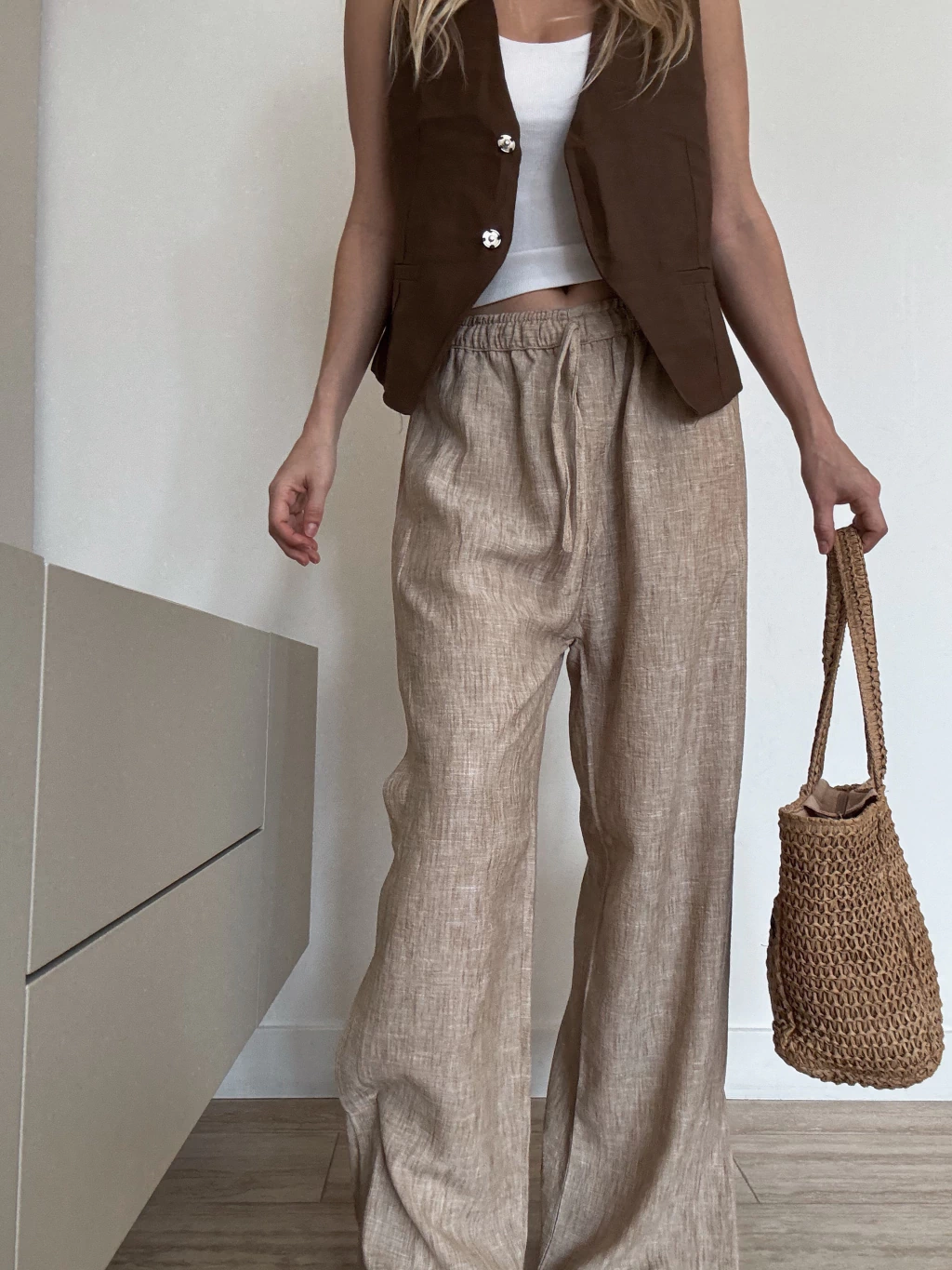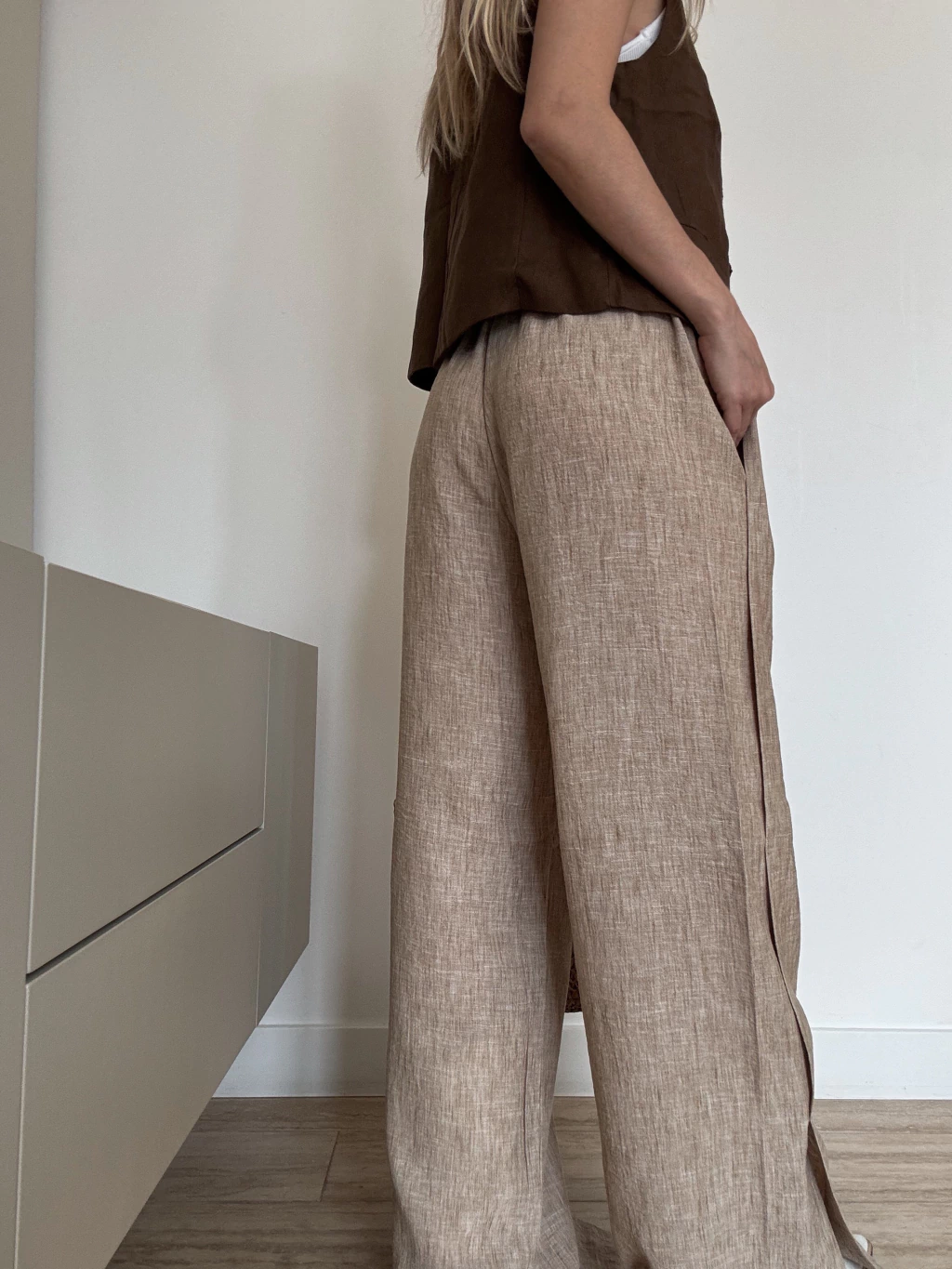 Pantalon ancho con alforzas anchas laterales y tajo. Contiene cintura con elástico y lazo. Textil: voile simil lino, 100% calidad premium. El modelo es holgado y super cómodo, ideal para los días de calor! Esta prenda no te puede faltar si te vas de vacaciones a la playa ;) La modelo esta usando un talle S y mide 1.60.