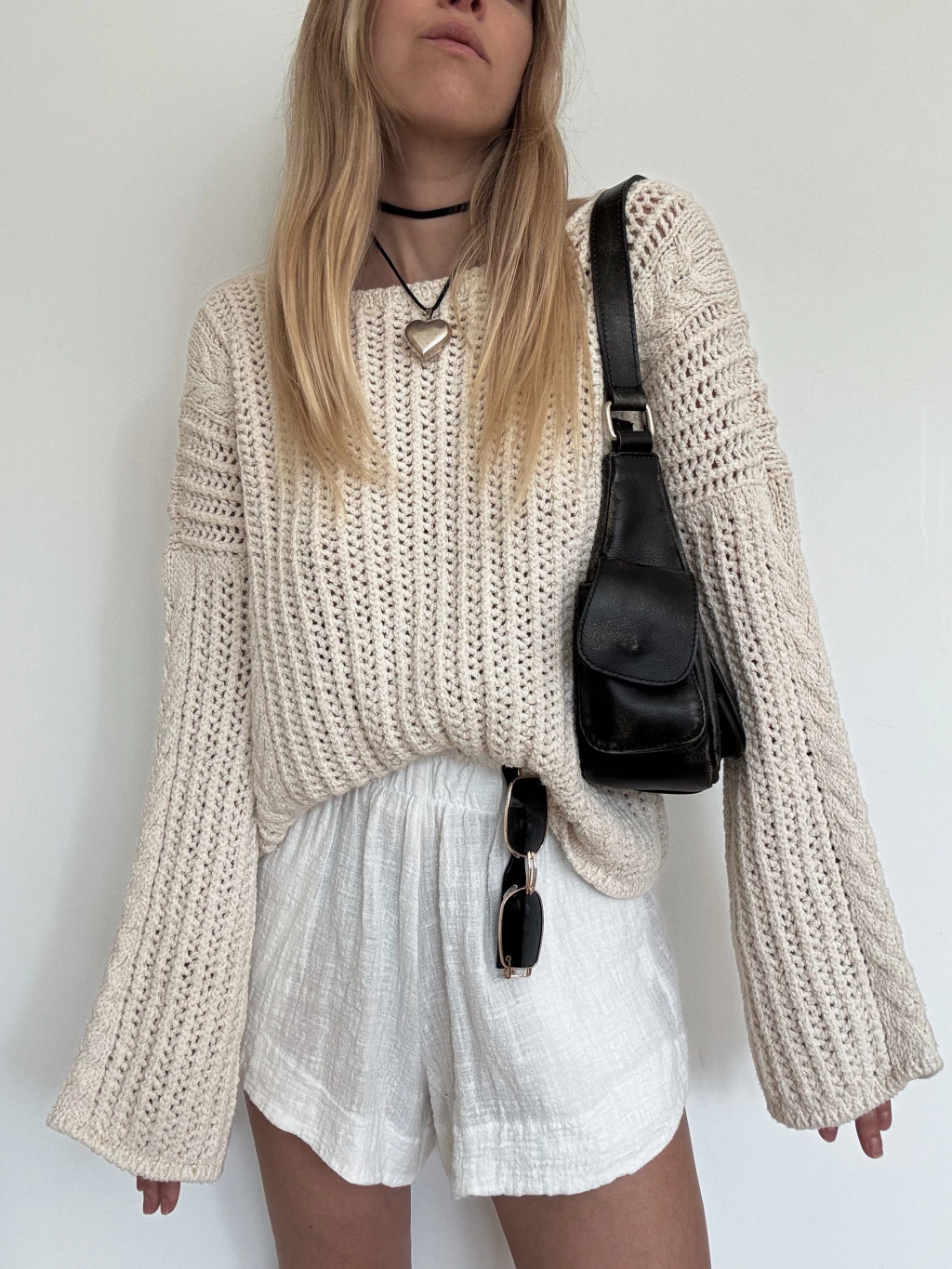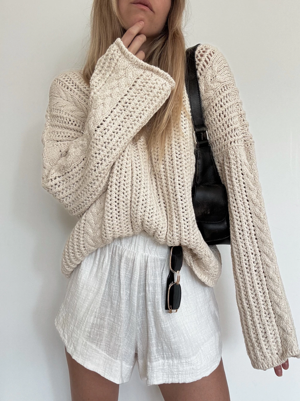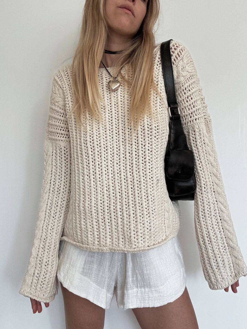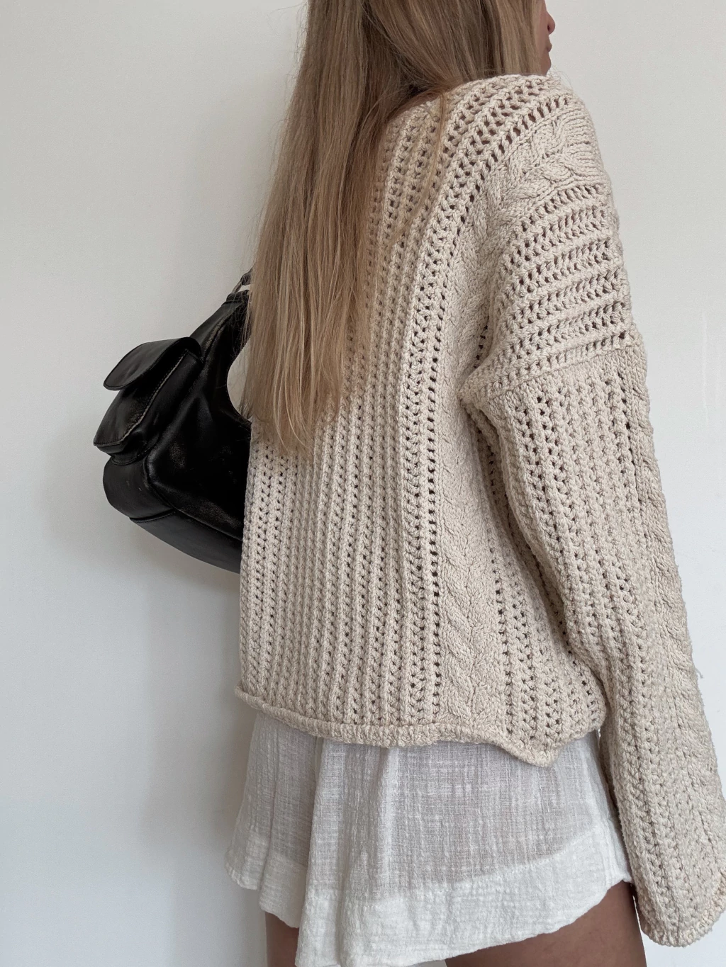 Sweater grueso calado con trenzas, cuello bote y terminación suelta. Material: hilado algodón, 100% calidad premium. Composición: algodón y lycra. El modelo es hermoso y super delicado, ideal para un día de verano/playa ;) Es talle único y abarca varios talles debido a que es una prenda elastizada.