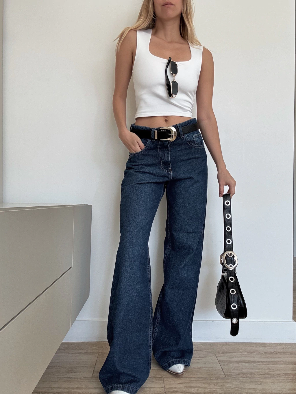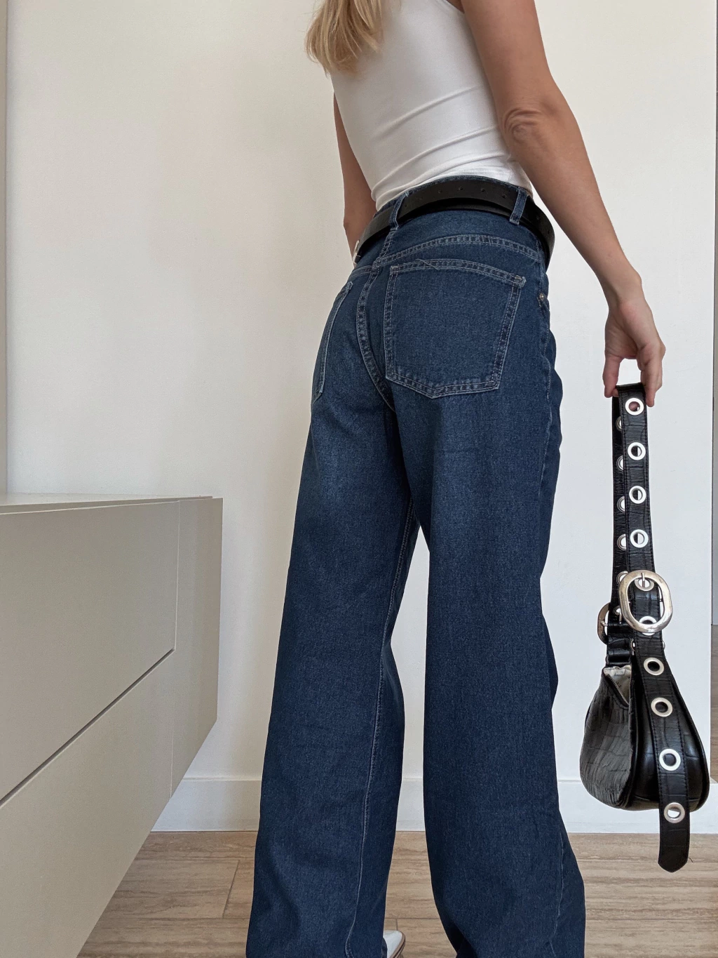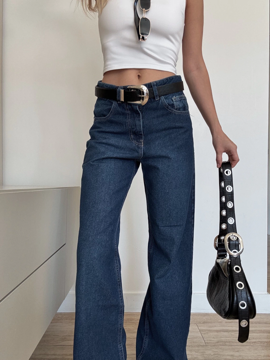 Jean wide leg tiro medio/alto lavado color azul oscuro. Textil: 100% denim rígido, calidad premium. El corte es muy cómodo y el color super canchero. Lo podes usar de noche o día con un estilo más casual <3 La modelo esta usando un talle 34 y mide 1.60. Para usarlo más holgado recomedamos un talle más del habitual.