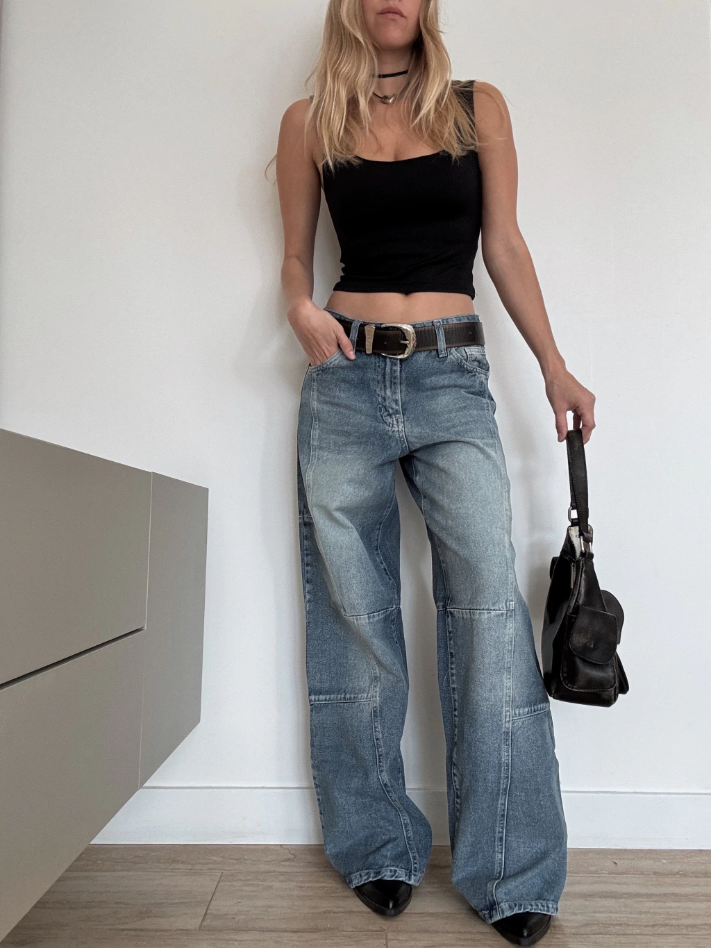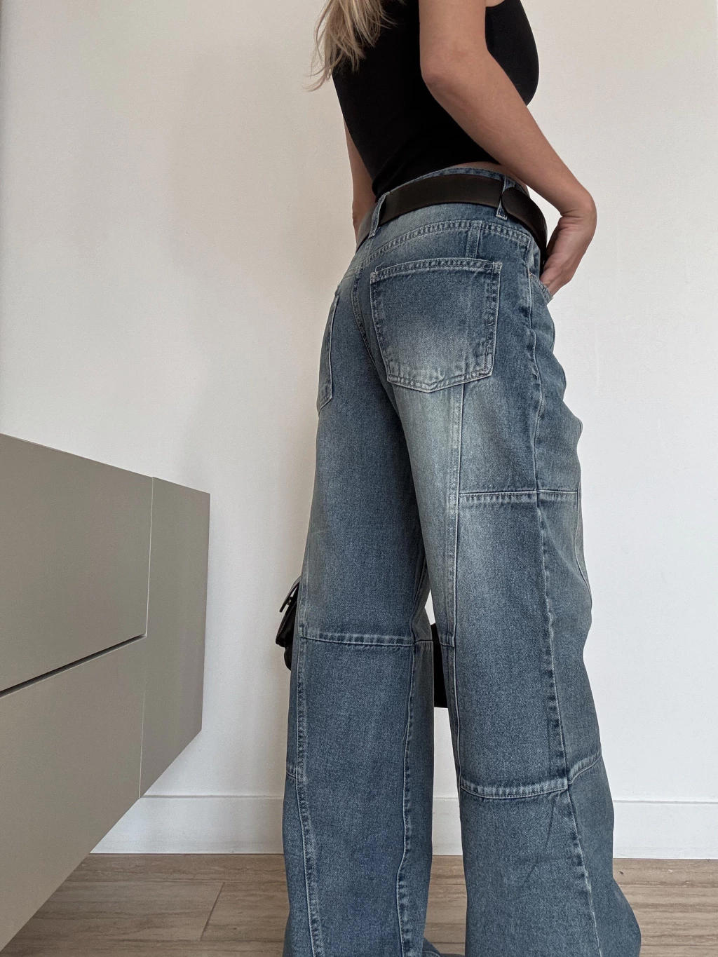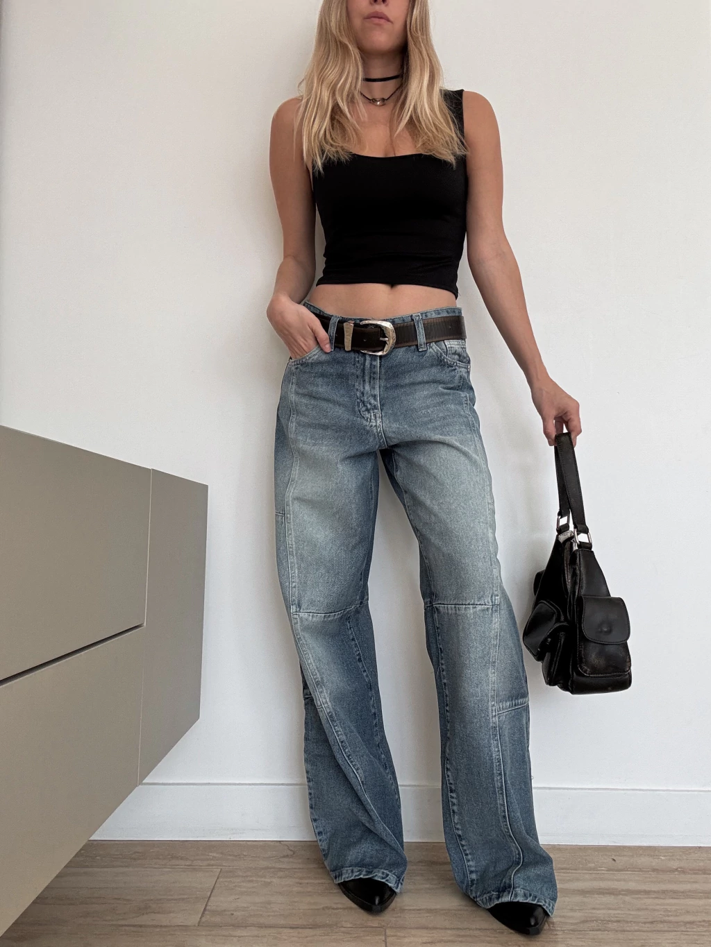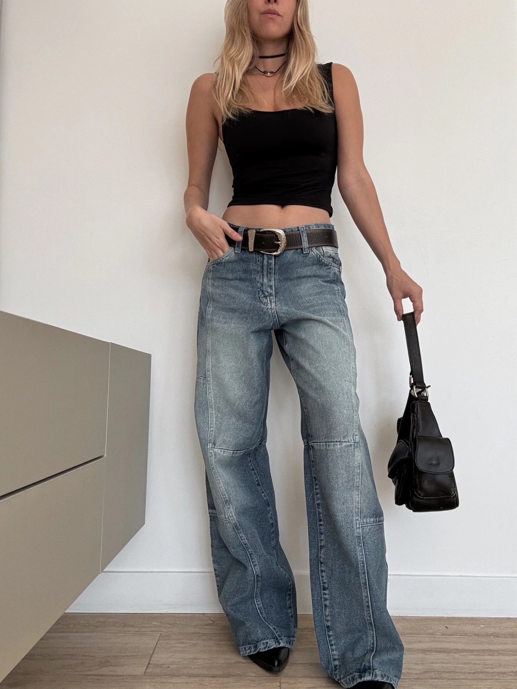 Jean wide leg tiro medio/bajo lavado azul con costuras. Textil: 100% denim rígido, calidad premim. El corte es muy cómodo! Lo podes usar de noche o día con un estilo más casual ;) La modelo esta usando un talle 34 y mide 1.60. Para usarlo más holgado/tiro bajo recomedamos un talle más del habitual. Este modelo de jean te va a enamorar!