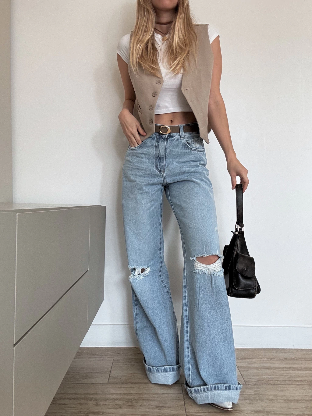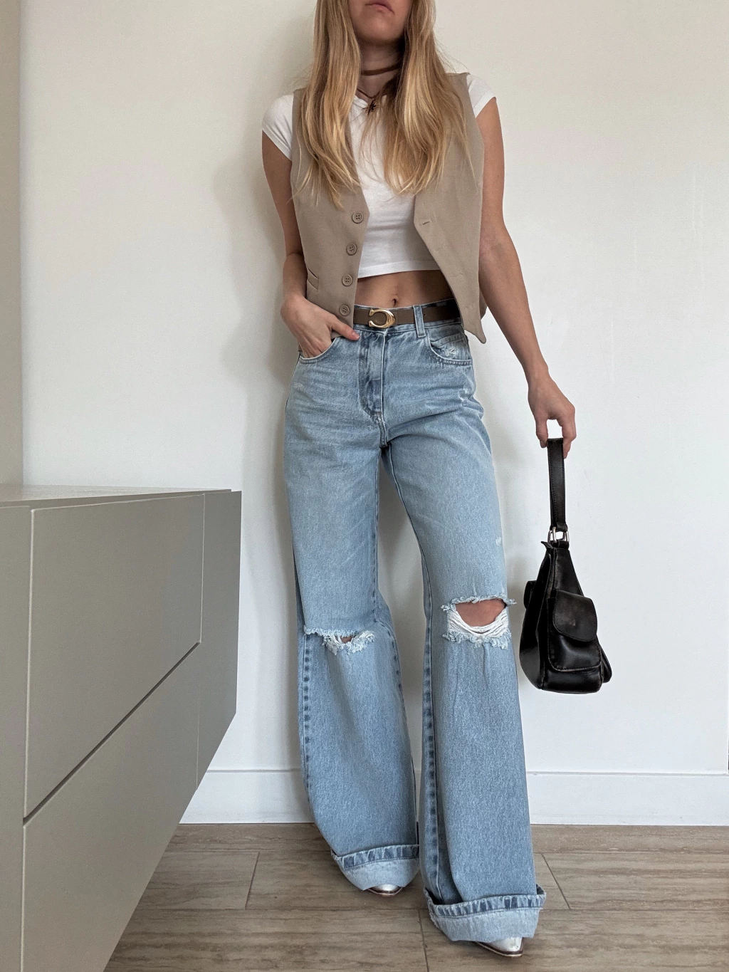 Jean wide leg tiro alto color celeste lavado con roturas en rodilla y pequeñas roturas en delantero. Textil: 100% denim rígido, calidad premium. El corte es muy cómodo y el color super canchero. Lo podes usar de noche o día con un estilo más casual. La modelo esta usando un talle 36 y mide 1.60. Los talles son reales, para usarlo más holgado o tiro bajo recomedamos elegir un talle más del habitual.