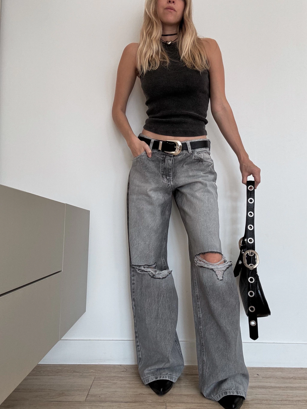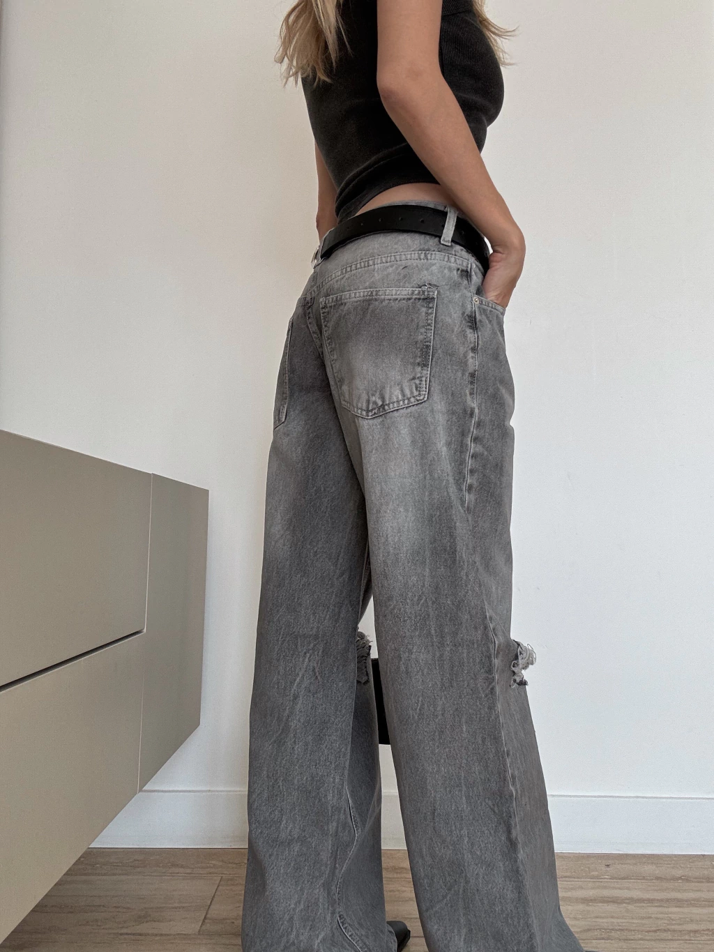 Jean wide leg tiro bajo lavado con roturas en rodillas. Textil: 100% denim rígido, calidad premim. Super canchero! Lo podes usar de noche con unas botitas o de día con zapas para un estilo más casual ;) La modelo esta usando un talle 34 y mide 1.60, le queda bien tiro bajo.
